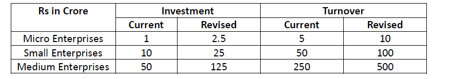 •To achieve higher efficiencies of scale, technological upgradation and better access to capital, the investment and turnover limits for classification of all MSMEs has been enhanced to 2.5 and 2 times respectively